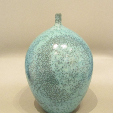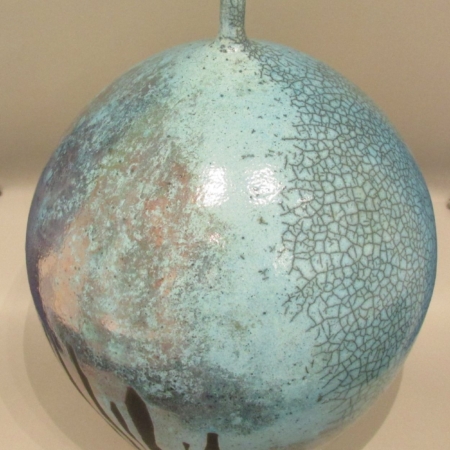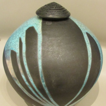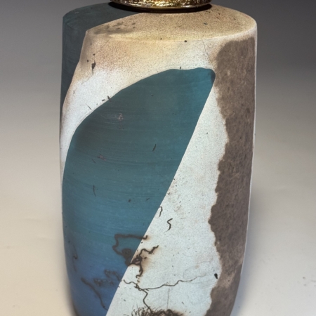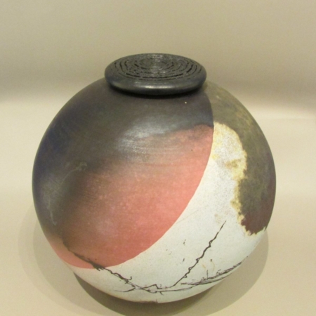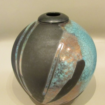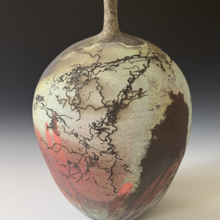 Raku is a sixteenth century Japanese firing process originally intended to produce ceremonial tea ware. It involves firing a piece to around 1850 degrees F, pulling it out of the kiln with tongs, then placing it in combustibles such as straw or sawdust. A cover is placed over the glowing piece, forcing the fire to smolder and engulf it with smoke. This smoke changes the chemical composition of the glazes by creating a “reducing” environment. This “reduction” changes copper glazes from green to metallic red, while turning any bare clay jet black. On non metallic glazes, a crackle effect is created when a piece is pulled from the hot kiln into the cold air, causing the glaze to shiver and crackle. As smoke penetrates the piece it enters the tiny array of cracks turning them black. Because of the unique Raku process, no two pieces will ever be the same.