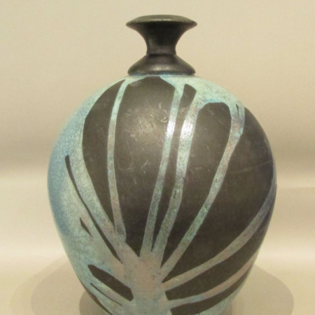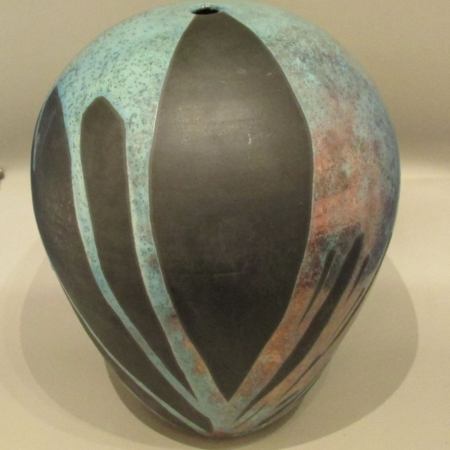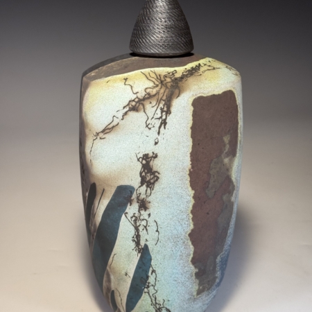 Sagger firing is a cousin to the Raku process. It involves coating the piece with a thin layer of clay known as Terra Sigillata which is burnished and then coated with a layers of ferric chloride. Various elements such as horse hair, sugar, coffee grinds are placed on top of the piece. The pot is then covered in layers of aluminum foil and fired in a kiln at a relatively low temperature where the aluminum burns off and the resulting pot gets all the various colors and patterns. Once fired the pots are coated with wax and then polished.