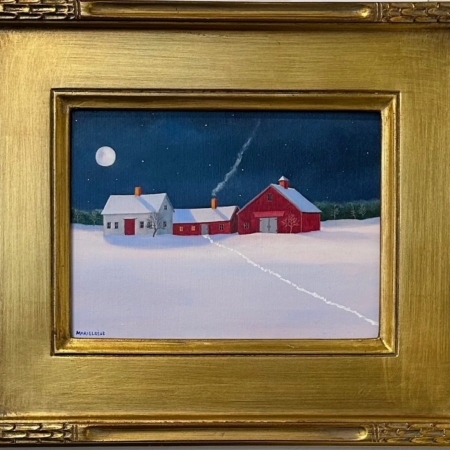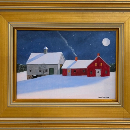 The traditional rural farmscapes and barns continue to populate Marieluise’s paintings of quintessential New England. She enjoys paying homage to once-prominent farmsteads as well as cottages along New England’s coast. Marieluise began to paint in her late twenties and is entirely self-taught. Her work has a tone of thoughtfulness, a tangible silence. An image may evoke the feeling of a crisp autumn evening, the pensive passage from fall breezes to the chill snap of winter, or the solitude that follows a New England snowfall. Her vision is precise, without action, leaving much to the viewer’s imagination. In essence, Marieluise’s paintings stir memories and embody Yankee values of character, integrity and promise.