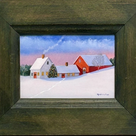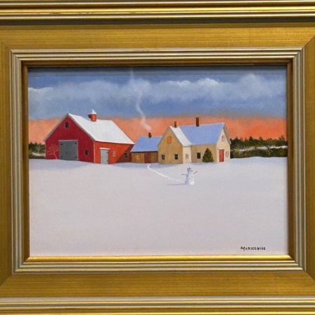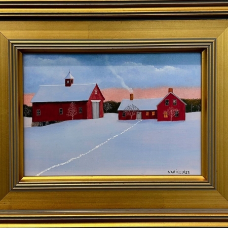 The traditional rural farmscapes and barns continue to populate Marieluise’s paintings of quintessential New England. She enjoys paying homage to once-prominent farmsteads as well as cottages along New England’s coast. Marieluise began to paint in her late twenties and is entirely self-taught. Her work has a tone of thoughtfulness, a tangible silence. An image may evoke the feeling of a crisp autumn evening, the pensive passage from fall breezes to the chill snap of winter, or the solitude that follows a New England snowfall. Her vision is precise, without action, leaving much to the viewer’s imagination. In essence, Marieluise’s paintings stir memories and embody Yankee values of character, integrity and promise.